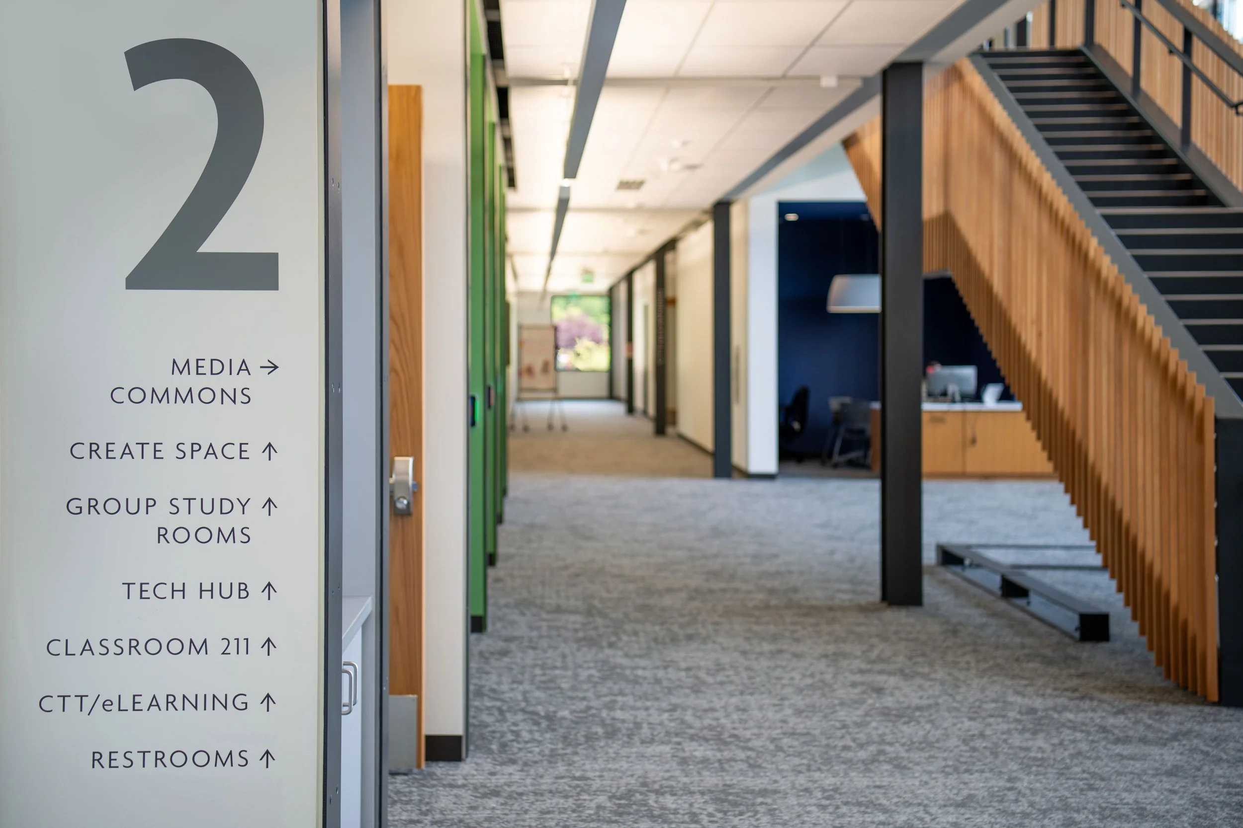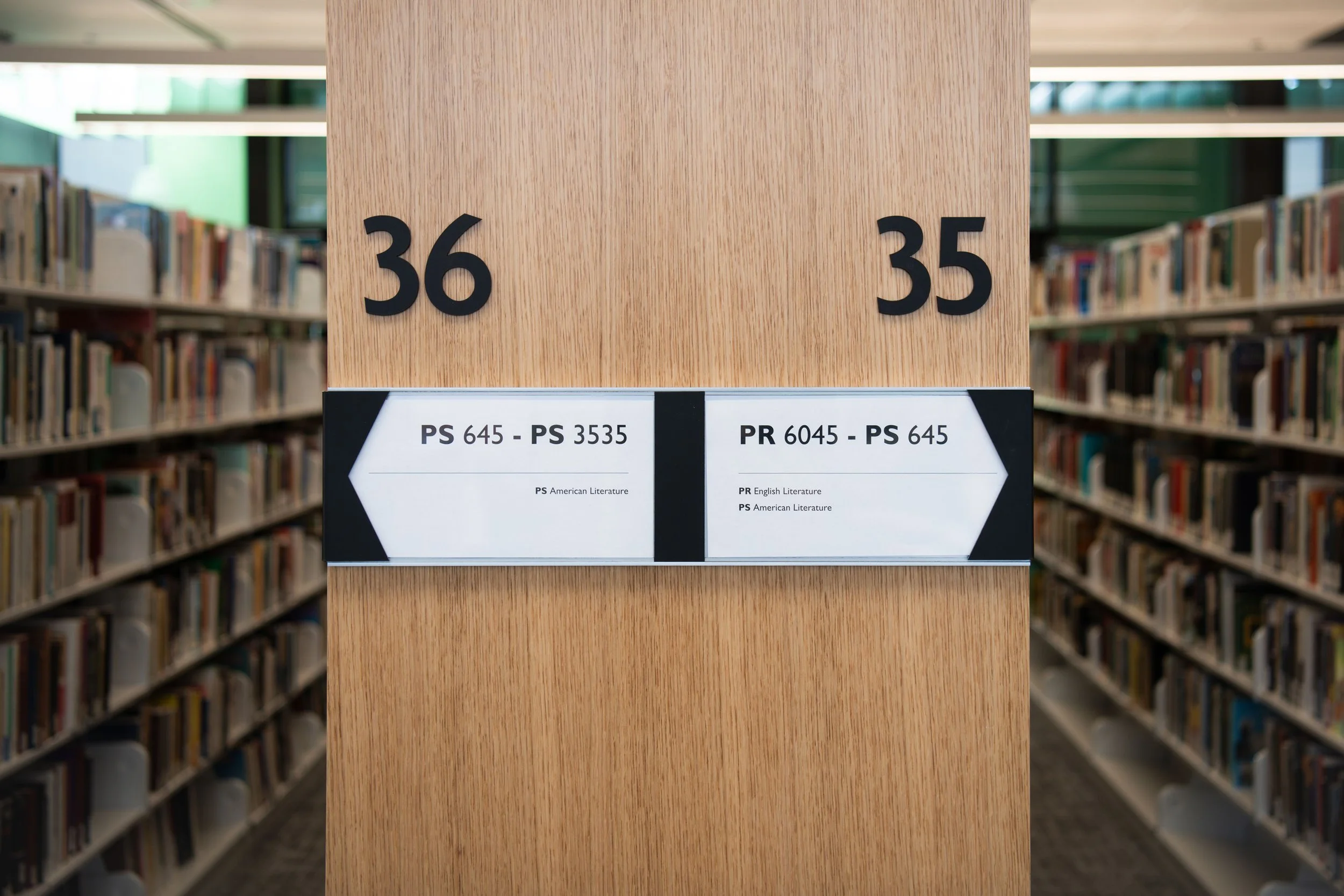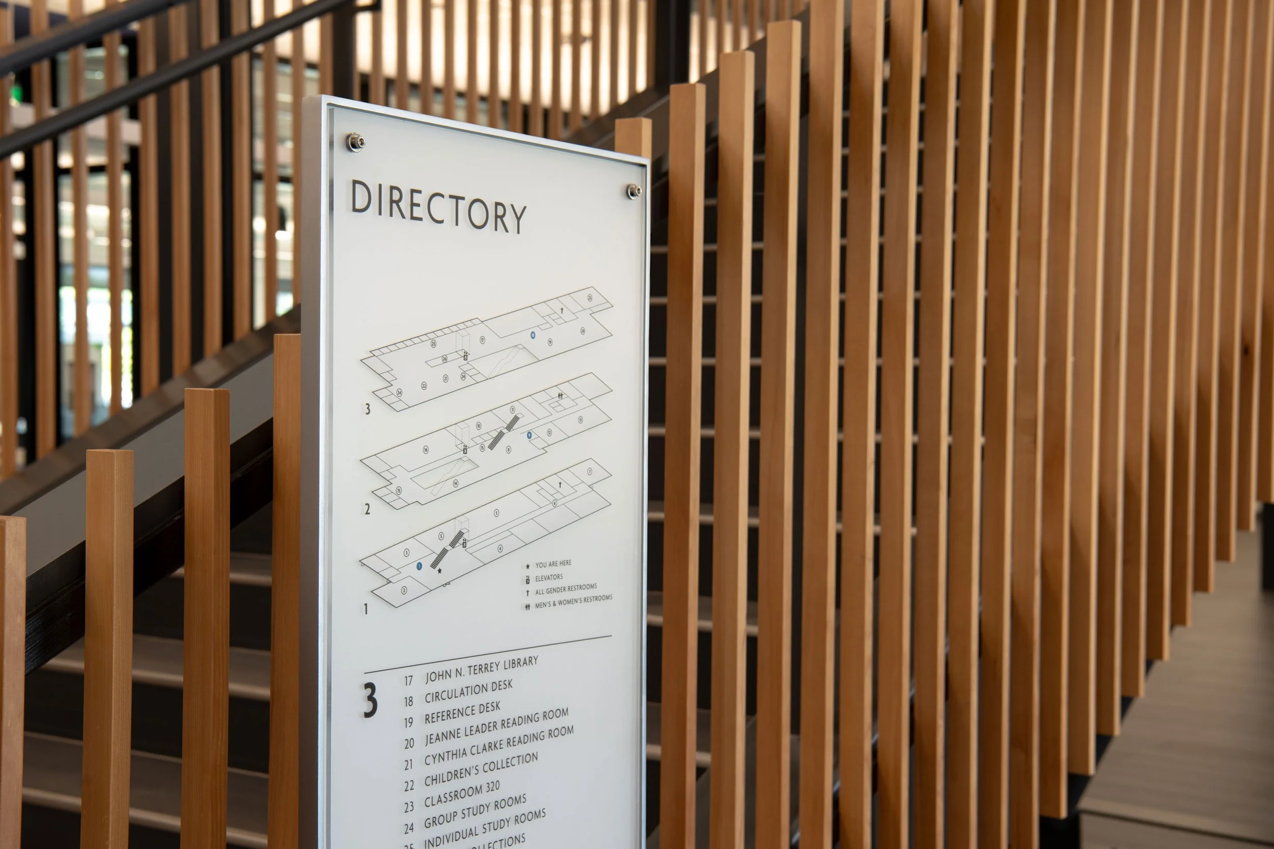 For this project, I collaborated on signage strategy and design; produced layouts for a directory and library stack signage; processed/produced large glazing graphics from a historic map; and created all technical drawings and plans for location, fabrication, and installation.