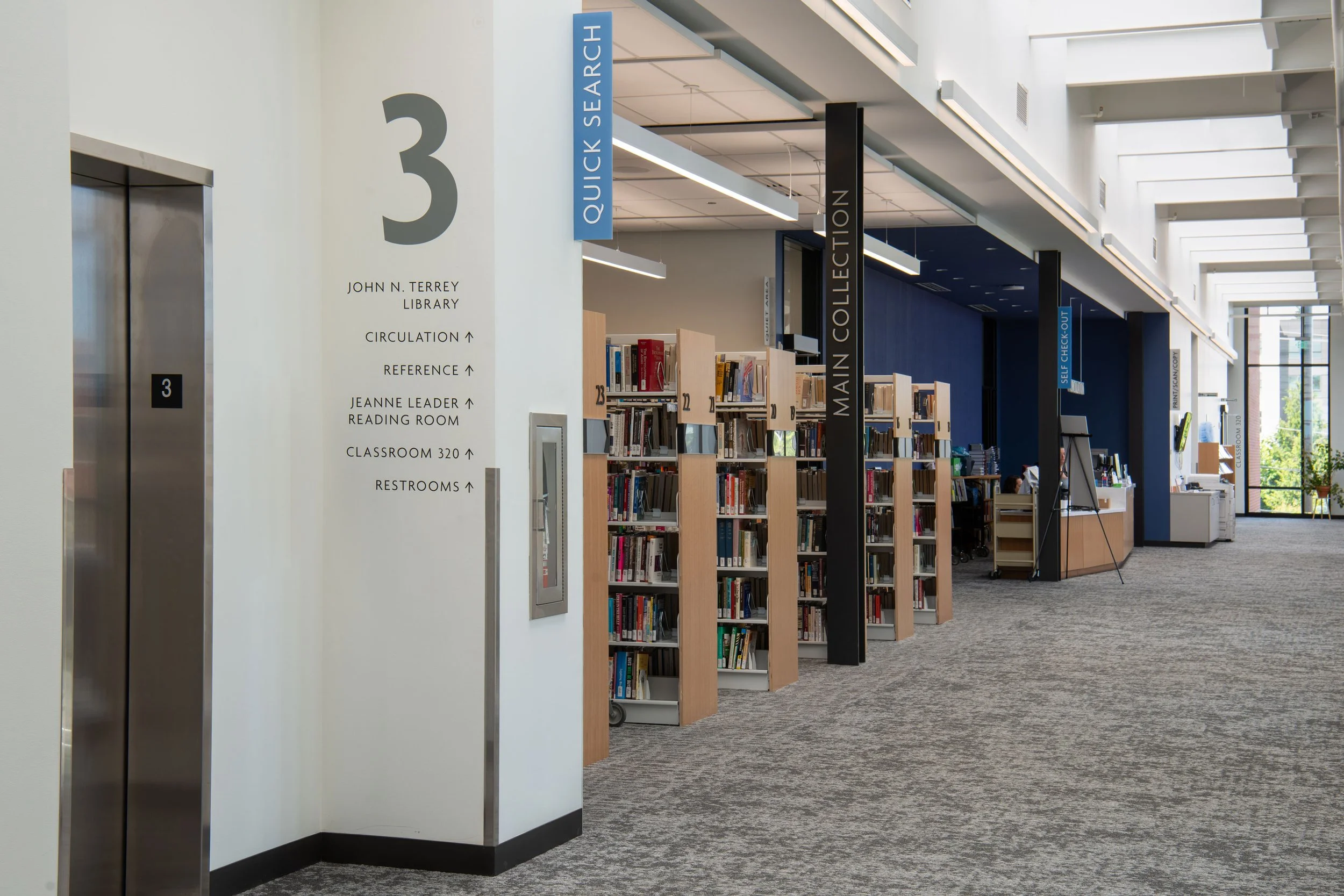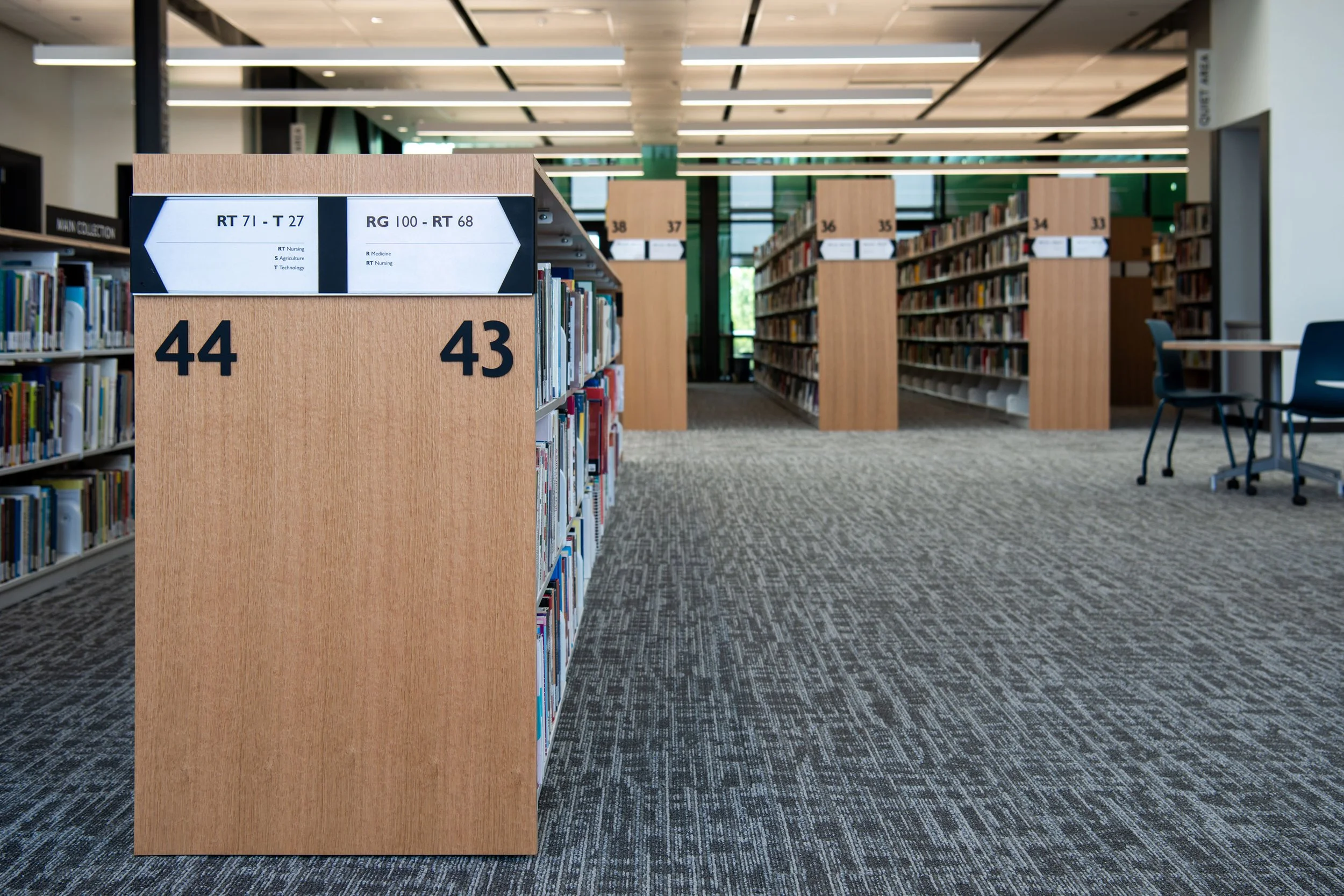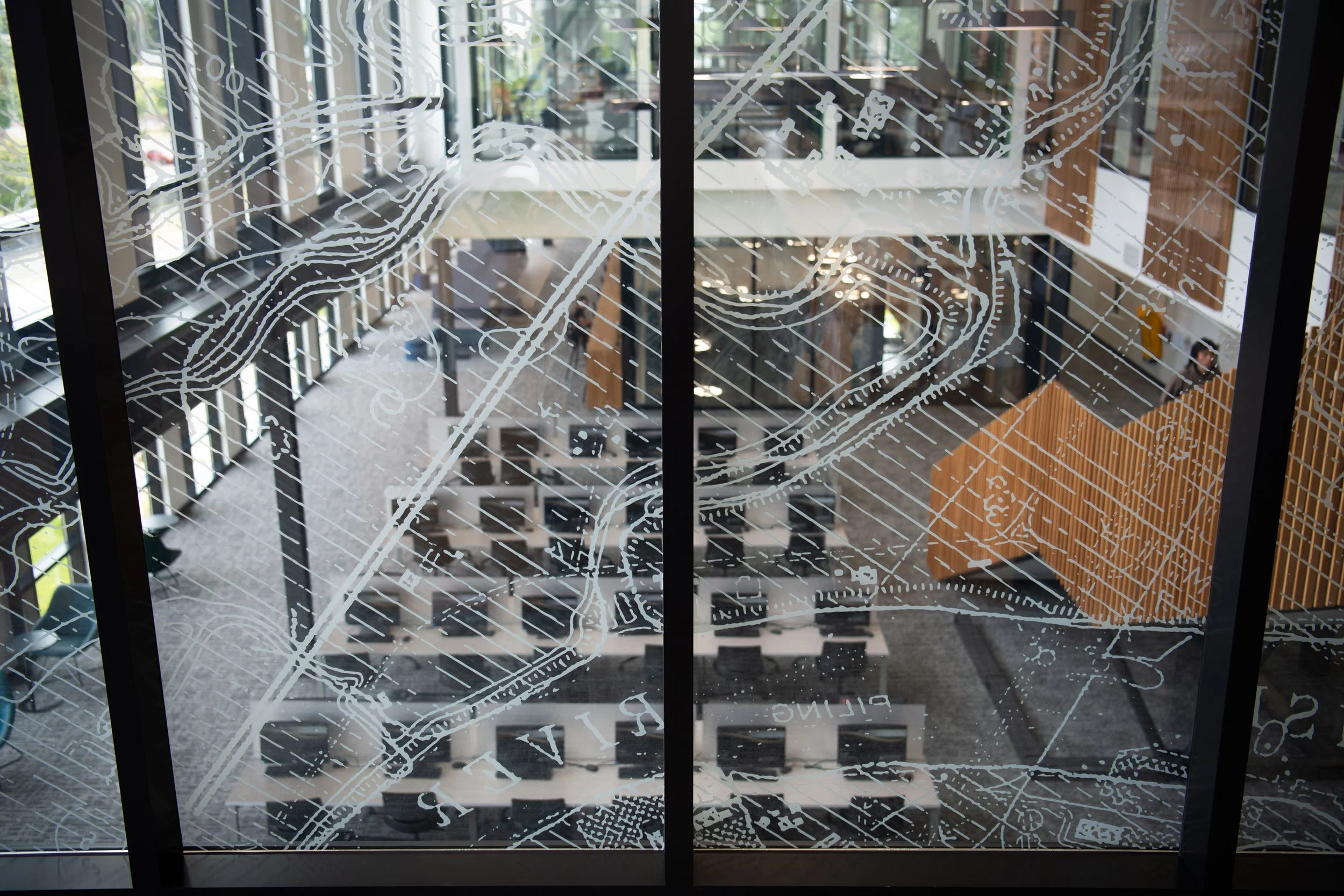For this project, I collaborated on signage strategy and design; produced layouts for a directory and library stack signage; processed/produced large glazing graphics from a historic map; and created all technical drawings and plans for location, fabrication, and installation.