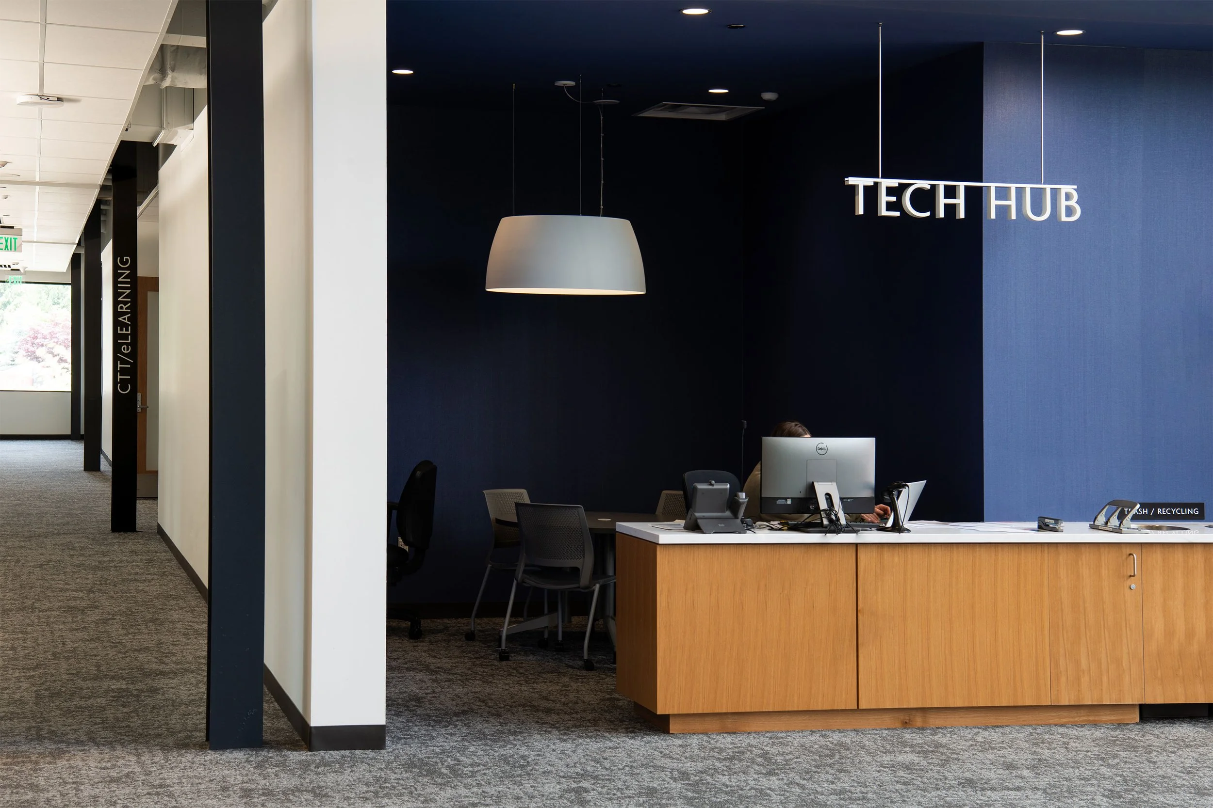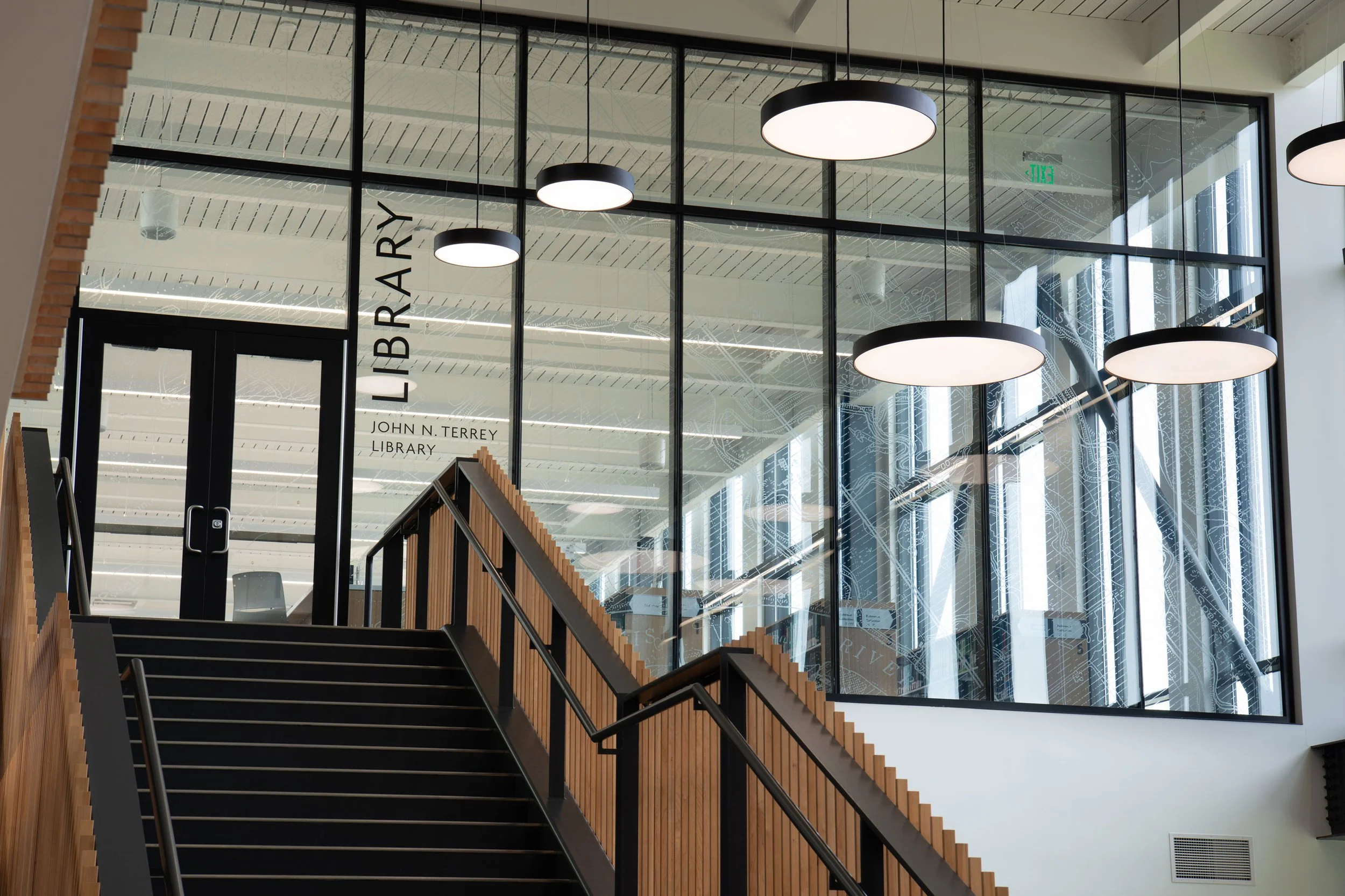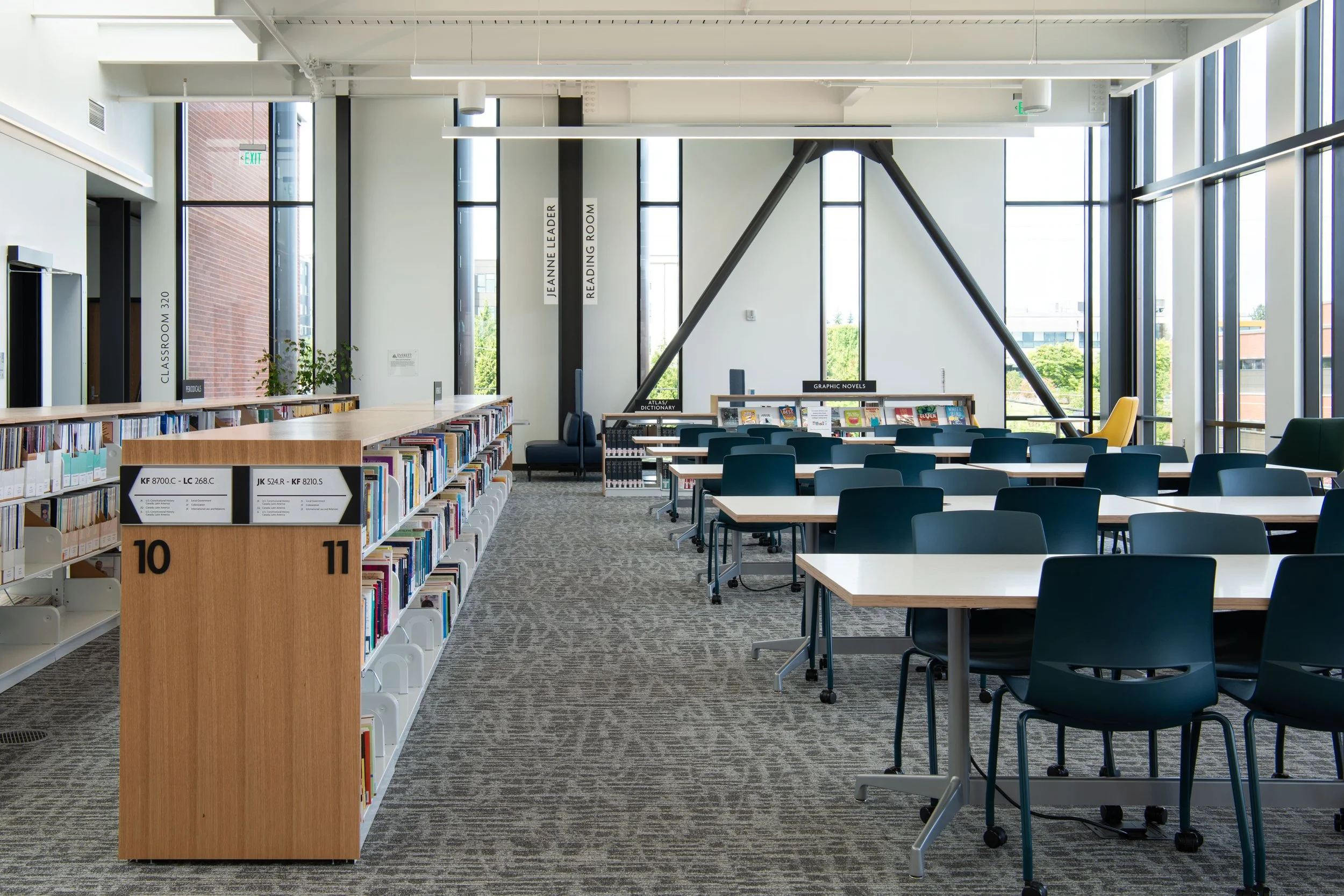 The Cascade Learning Resource Center is Everett Community College’s new library and tech hub, offering study rooms, tutoring, and other student resources, all organized around a broad central stair rising through a brightly lit atrium. The project marks a new phase of growth as the campus expands toward the eastern edge of downtown Everett and the environmentally significant Snohomish River estuary.