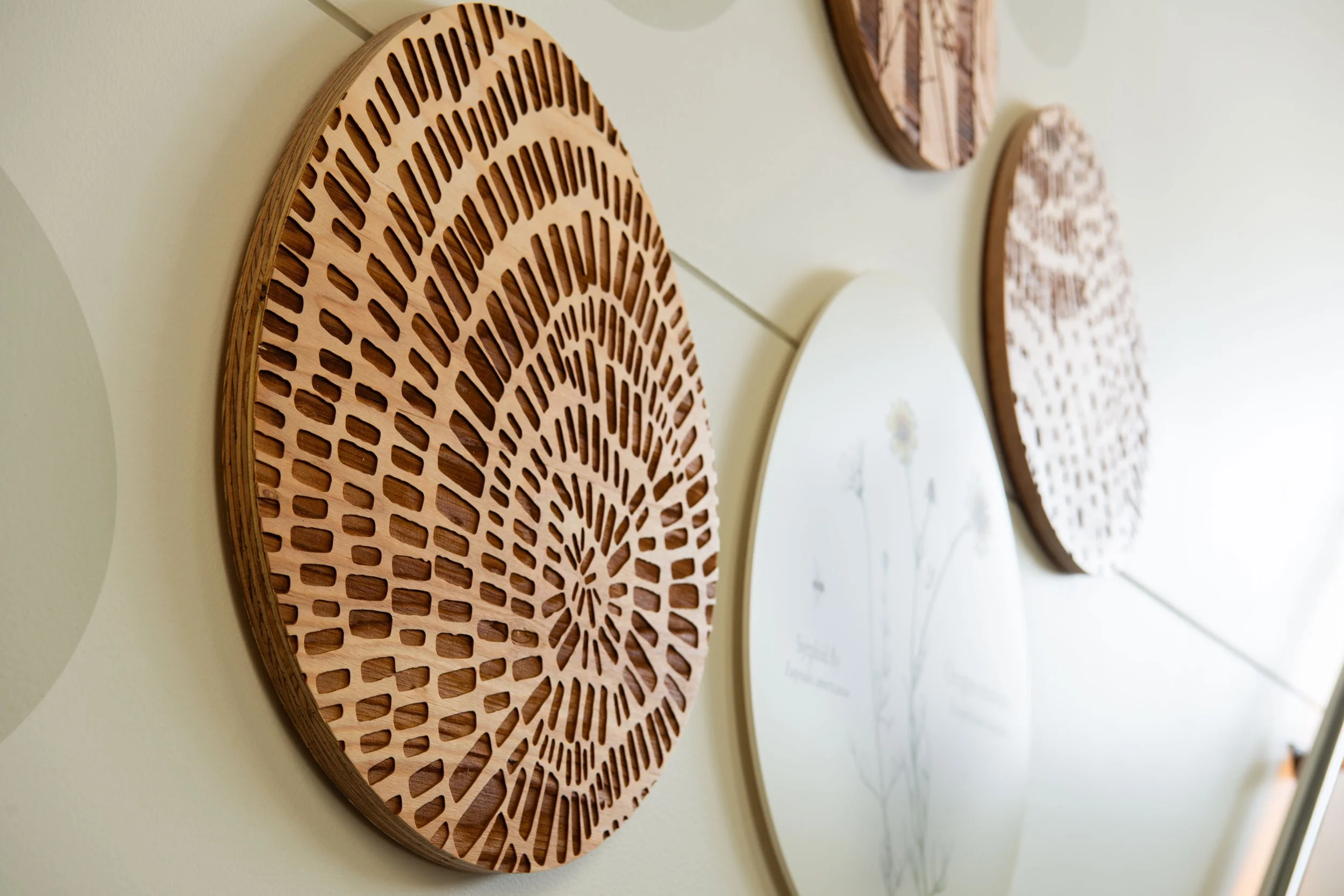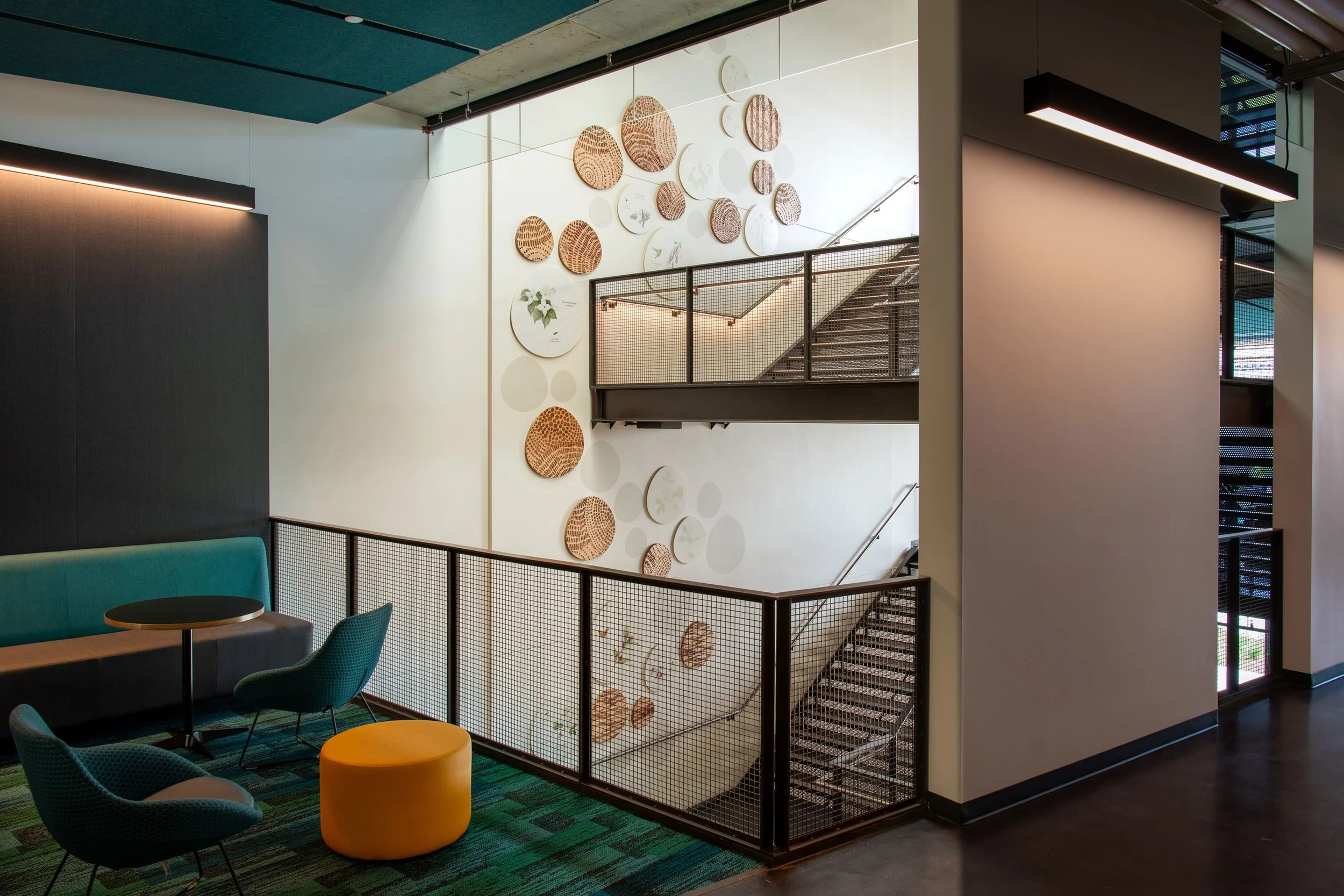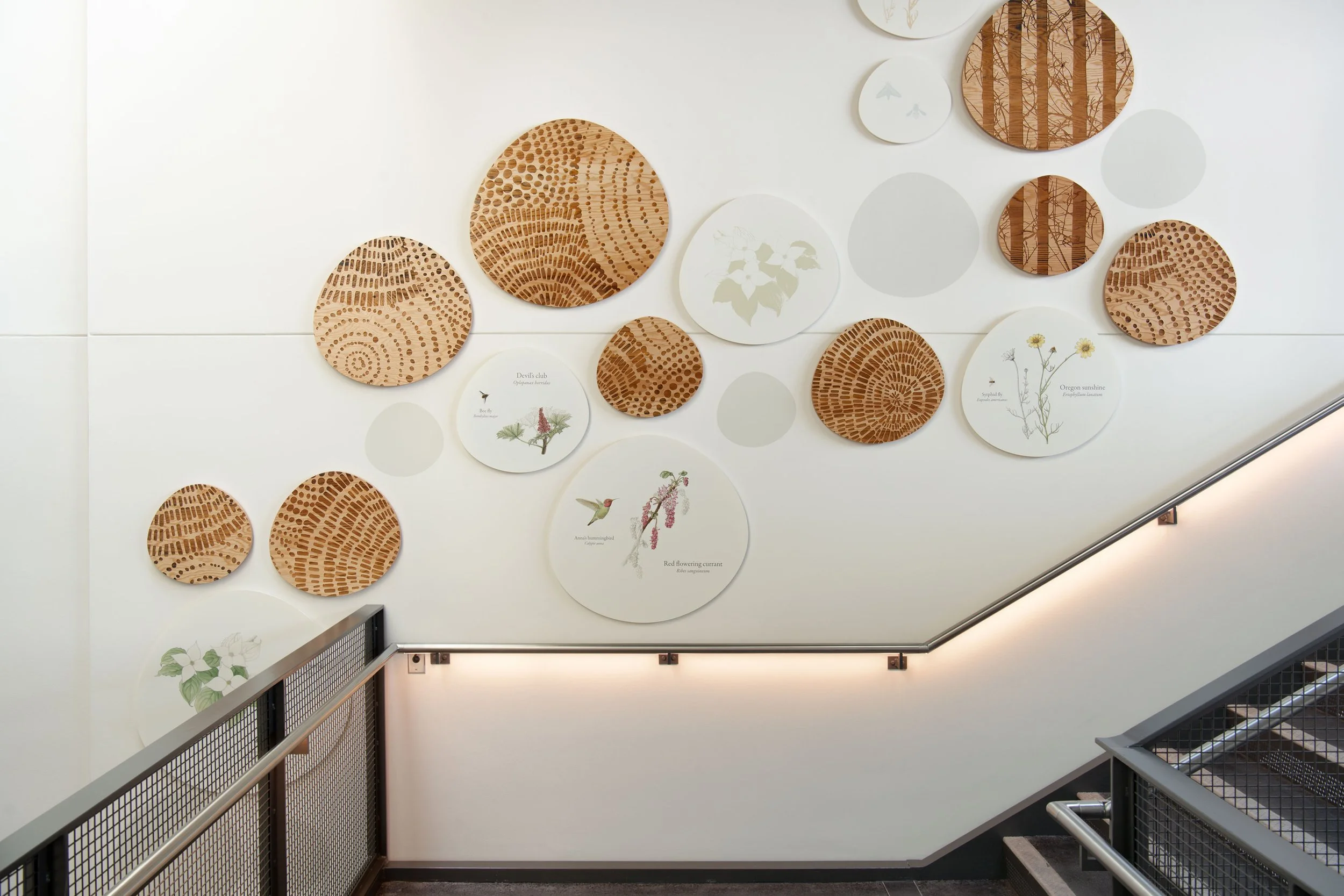 Inspired by the massing of rounded forms found in species maps and landscape plans, we created a series of similar shapes, arranged along the main staircase’s 70-foot-high wall in sweeping curves that mimic pollinator pathways. Wooden shapes are laser-etched with naturalistic patterns. Others bear illustrations by local botanical artist Janene Wallky, depicting native plants and pollinators found around campus, identified with binomial nomenclature.