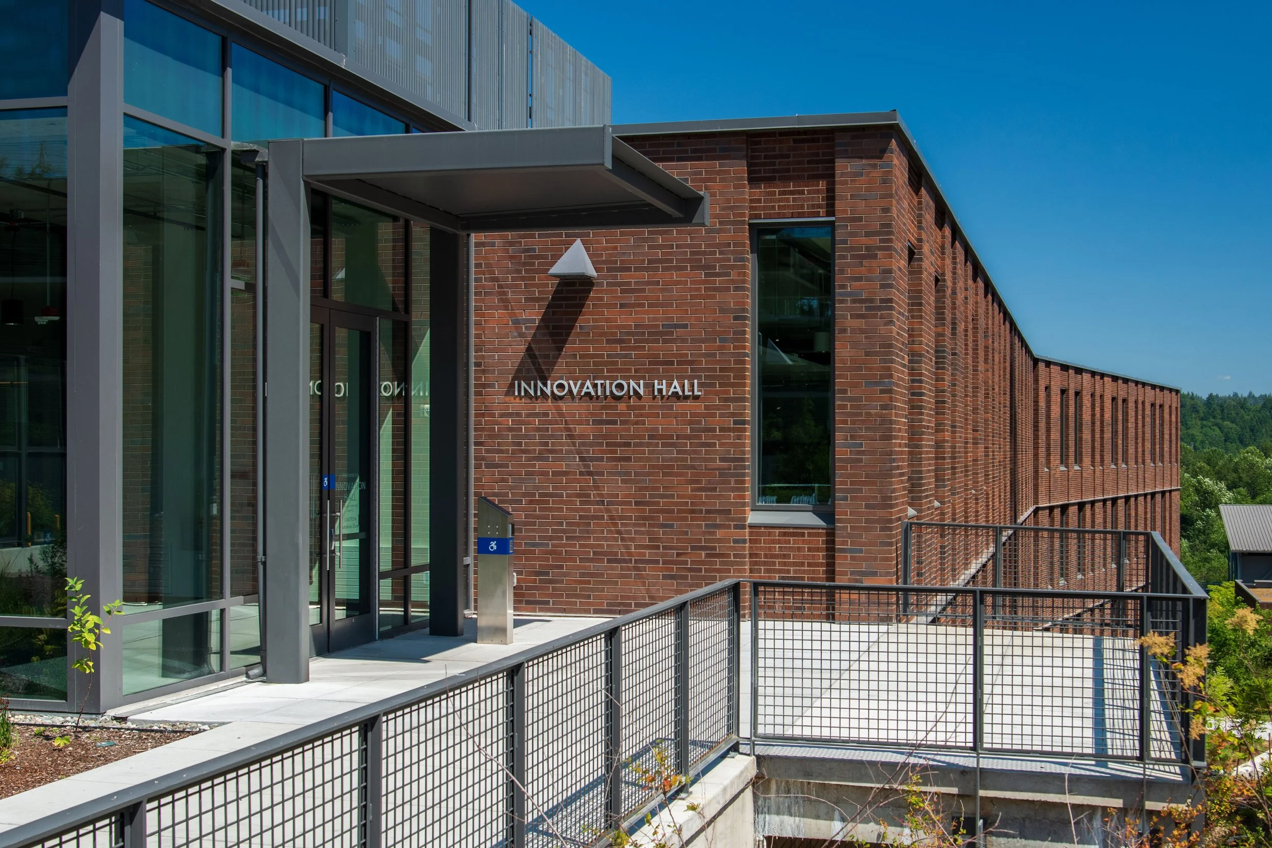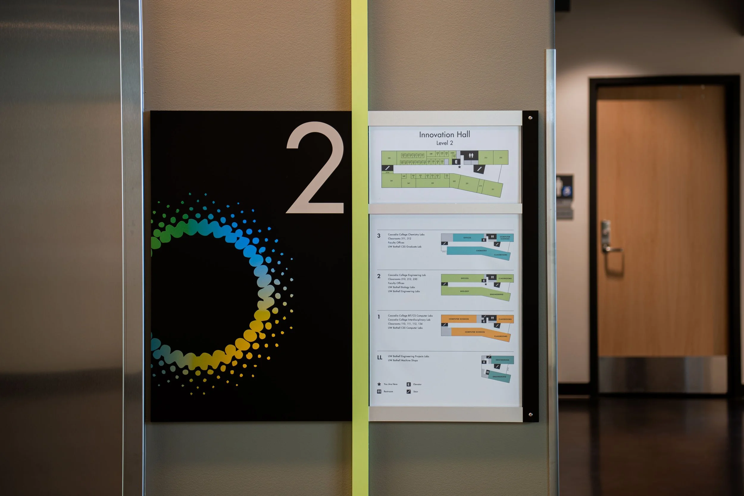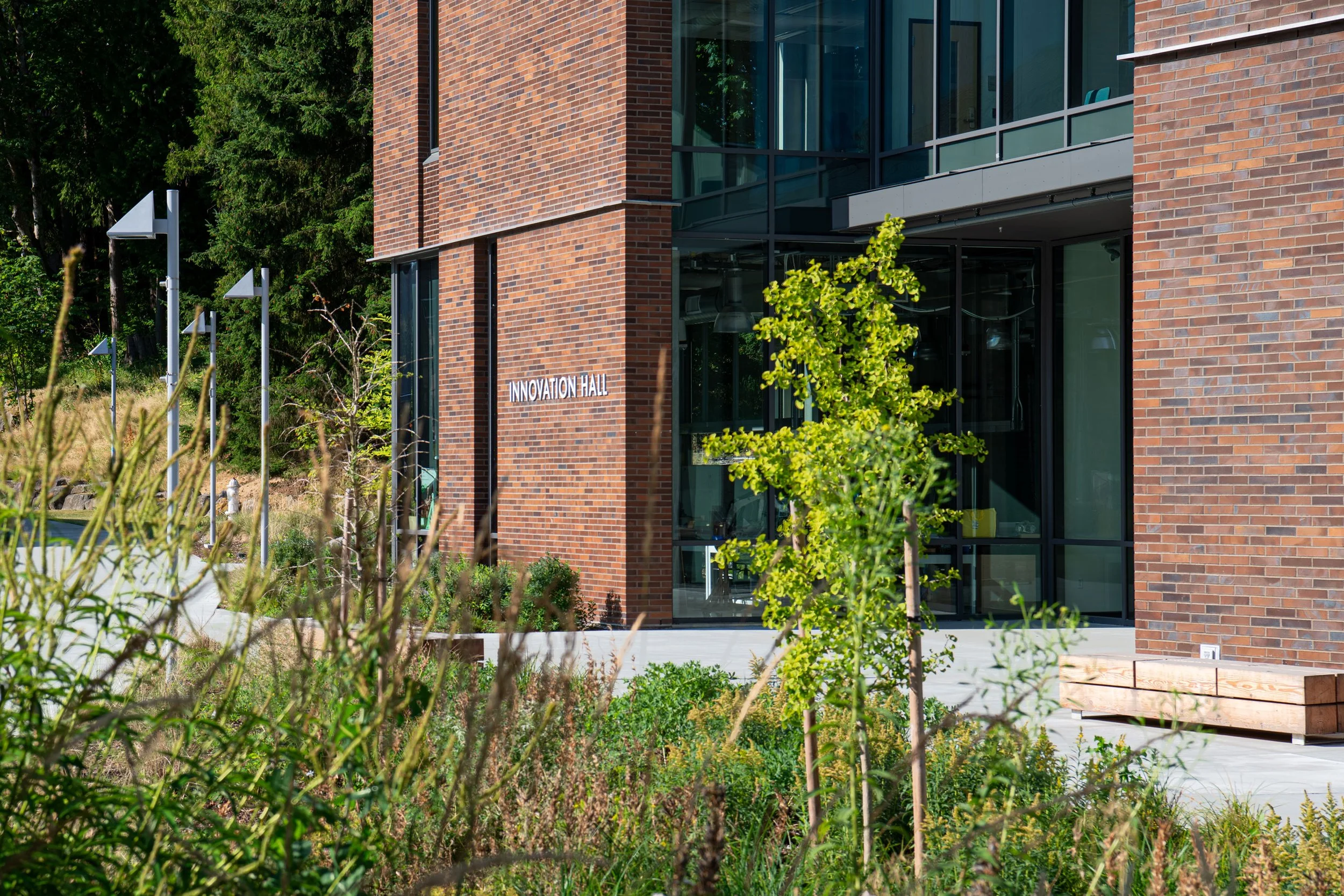 A unique collaborative venture between the University of Washington’s Bothell campus and Cascadia College, Innovation Hall is the new center of STEM instruction for both schools. This holistic thinking has driven other recent priorities, including environmentally focused efforts such as the restoration of adjacent wetlands and sustainable landscaping initiatives throughout campus. We chose to highlight native flora and fauna in our work here as they feature prominently in these priorities, with pollinators in particular serving as an apt metaphor for the symbiotic nature of the Innovation Hall project.