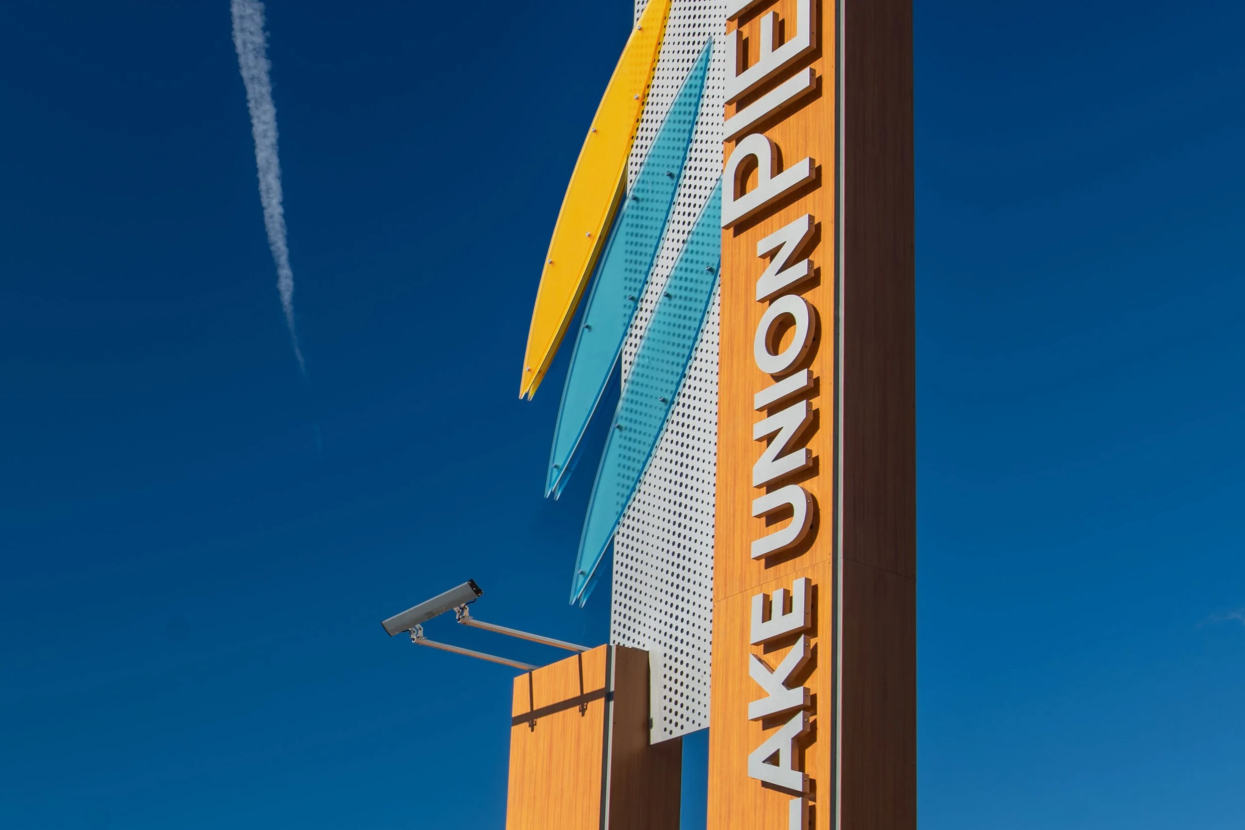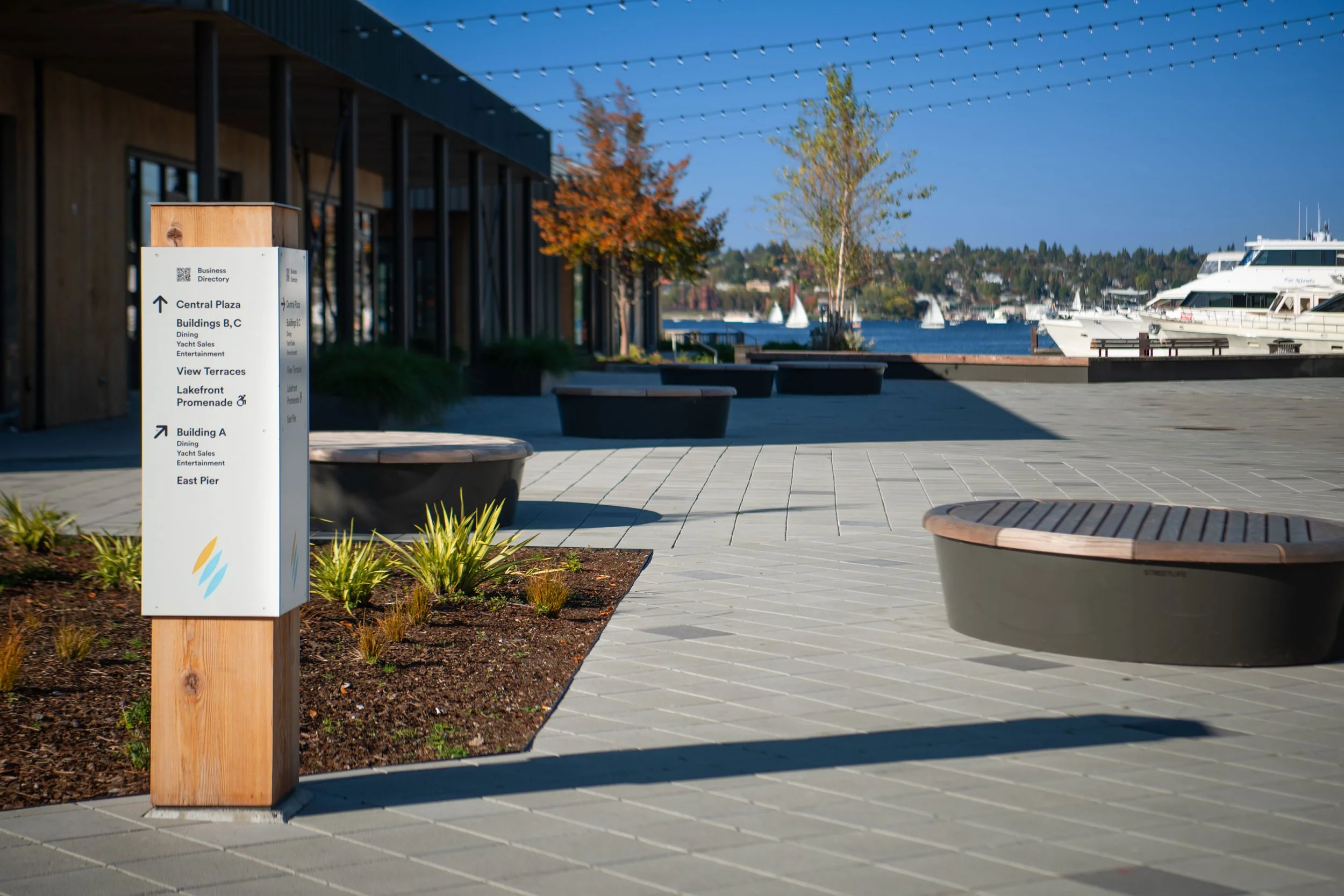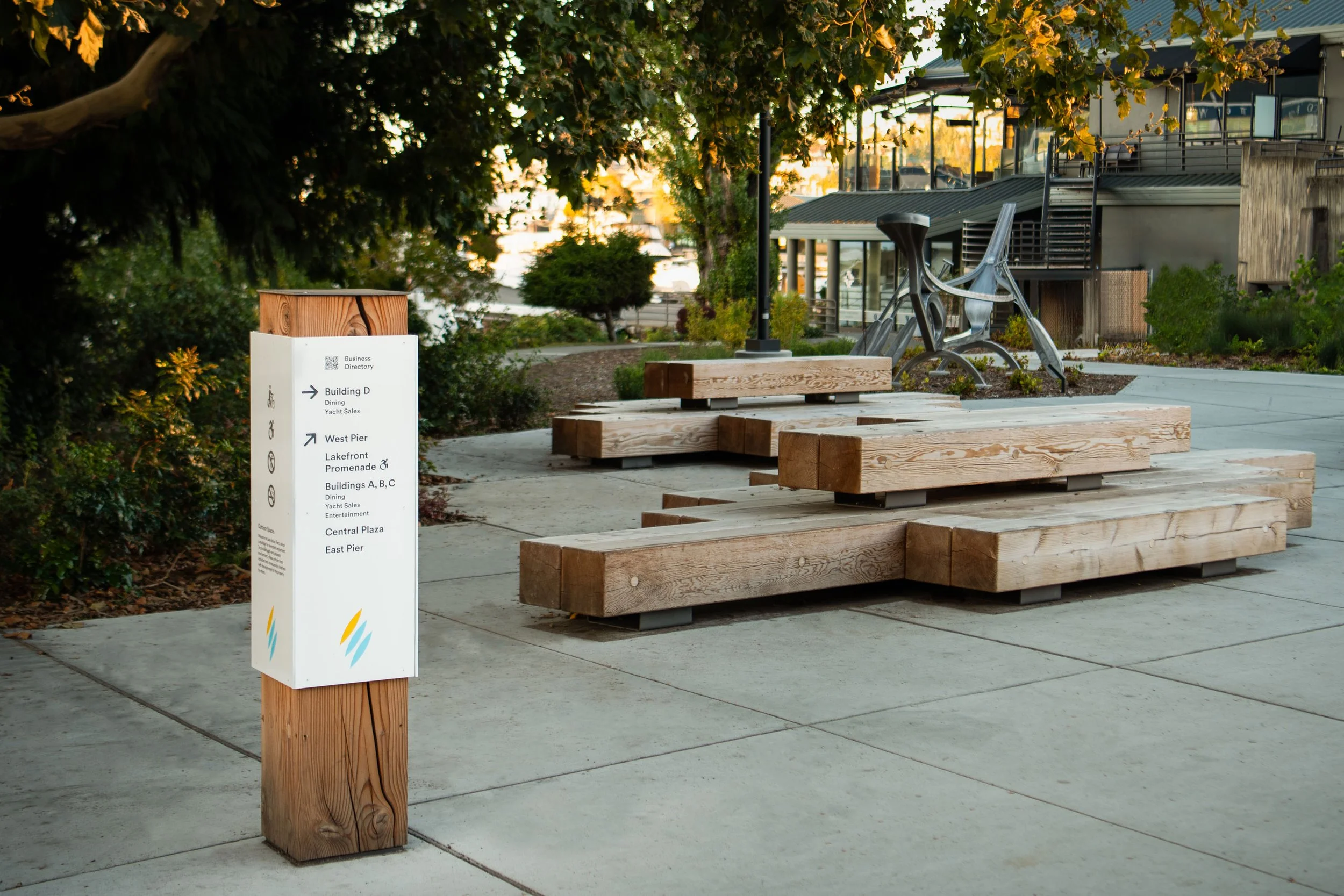 Large timber elements throughout the site reference its past, and we employed this material language in our signage design, along with an identity alluding to vessels lined up along a pier, and a luminous palette reflecting the site’s new vitality.