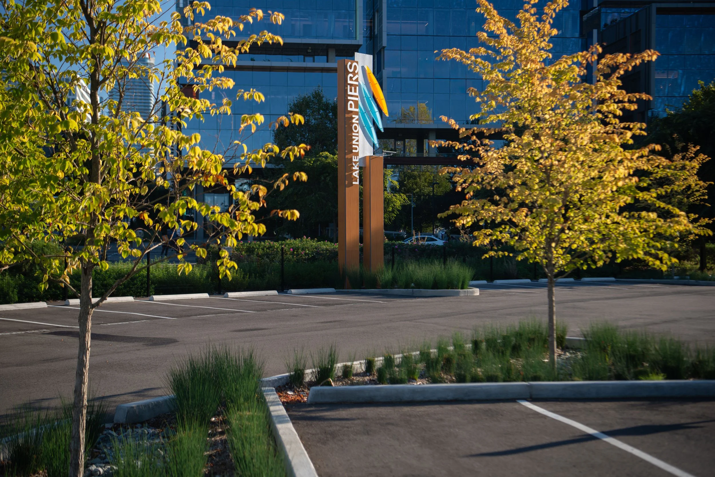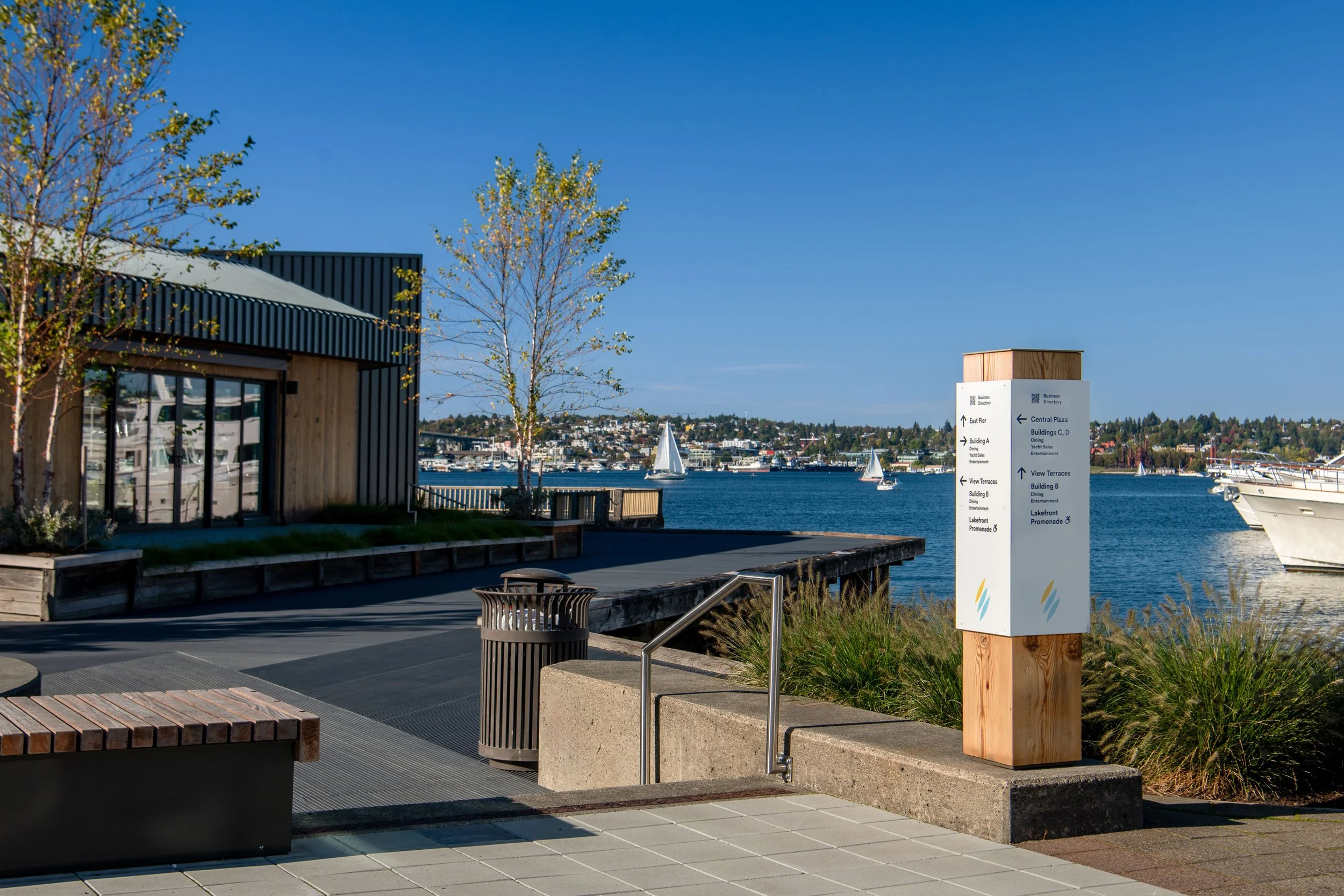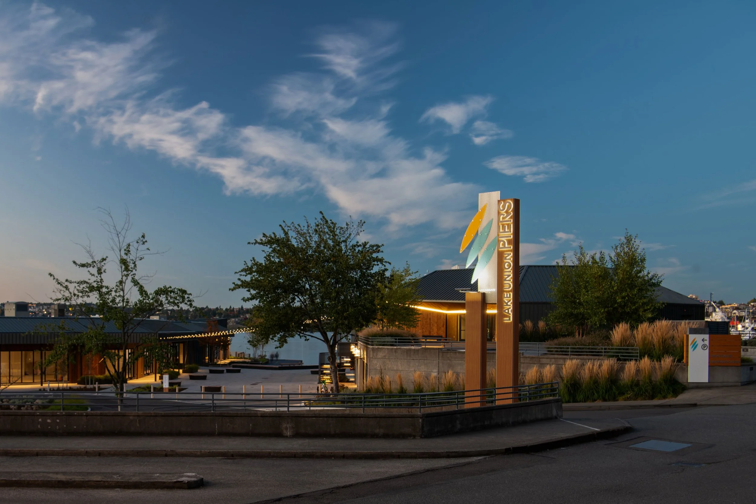 Through much of the previous century, the wooden piers that dotted the shoreline of Seattle’s Lake Union supported shipbuilding and other marine industrial activity. Renovation of this site at the south end of the lake aimed to celebrate this past, while also revitalizing a group of aging retail buildings and encouraging pedestrian flow among businesses, along lakefront promenades, and along the public trail that traverses the property.